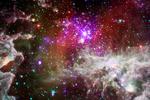 29 September 2011: To see the Universe in full, astronomers have to get creative. They combine multiple photos taken by different telescopes to make one colourful picture. For example, in this beautiful new picture of a star-forming cloud, the space telescope called Chandra only captured the purple regions. Meanwhile, another space telescope called Spitzer saw things a bit differently when it observed the same cloud – everything shown here other than the purple bits!