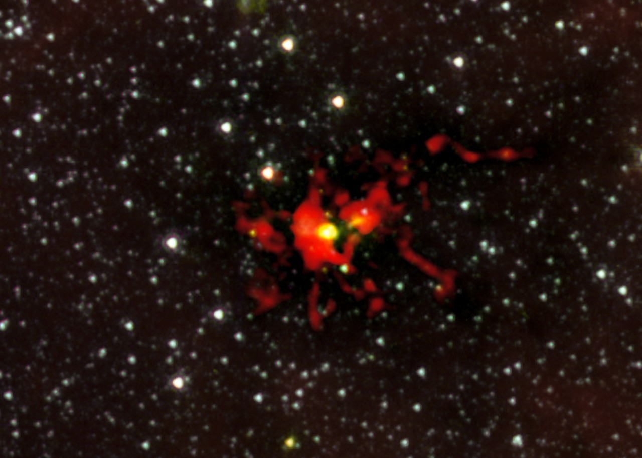The ‘womb’, or collapsing cloud, has over 500 times more material than the Sun. This makes it the largest of these clouds ever seen in our galaxy! The star-embryo growing inside is hungrily feeding on its material. The cloud is expected to give birth to a very brilliant star up to 100 times more massive than our Sun! Only about one of every 10,000 stars in our galaxy reaches that size!