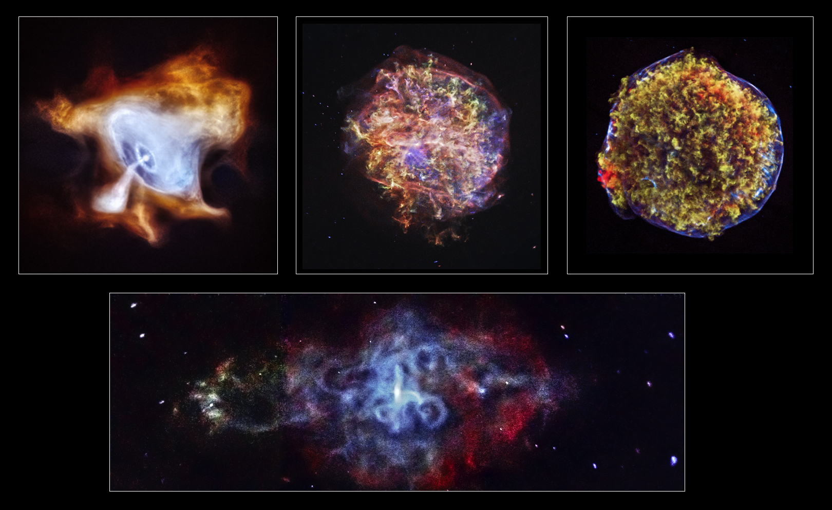 Moving from left to right, the objects are The Crab Nebula, 3292.0+1.8, Tycho’s Supernova and on the bottom is 3C58.
