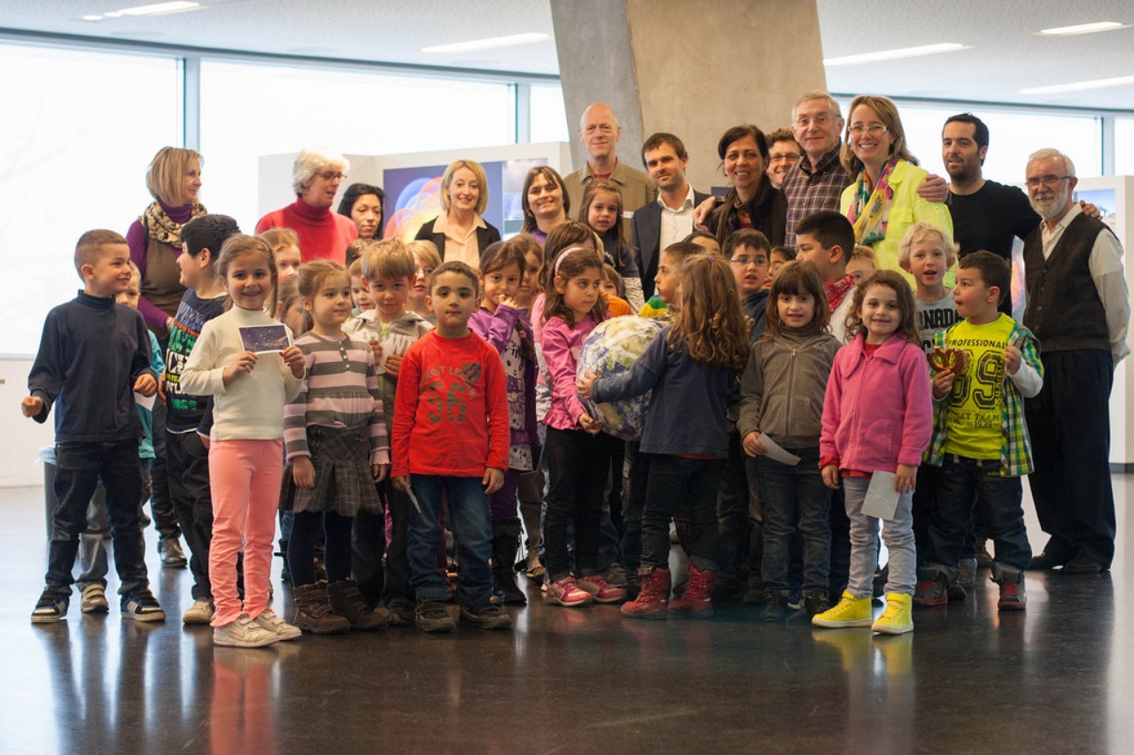 Members of the EU-UNAWE international team are joined by 60 local nursery children and two evaluators, at the House of Astronomy, Heidelberg in April 2013, for the annual evaluation of the programme.