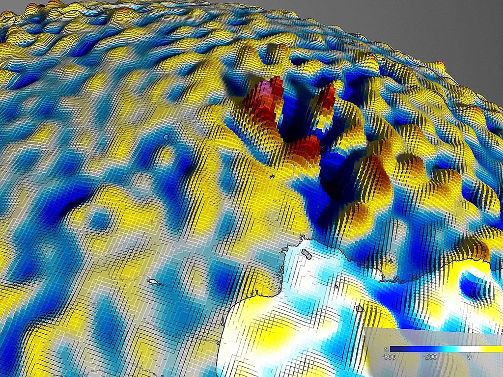 The Swarm satellites were used to create this image — the most detailed map of the Earth’s magnetic field ever made! The areas where the magnetic field is weaker are shown in blue, and the strongest regions are red. These differences are caused by the shape of Earth’s crust.