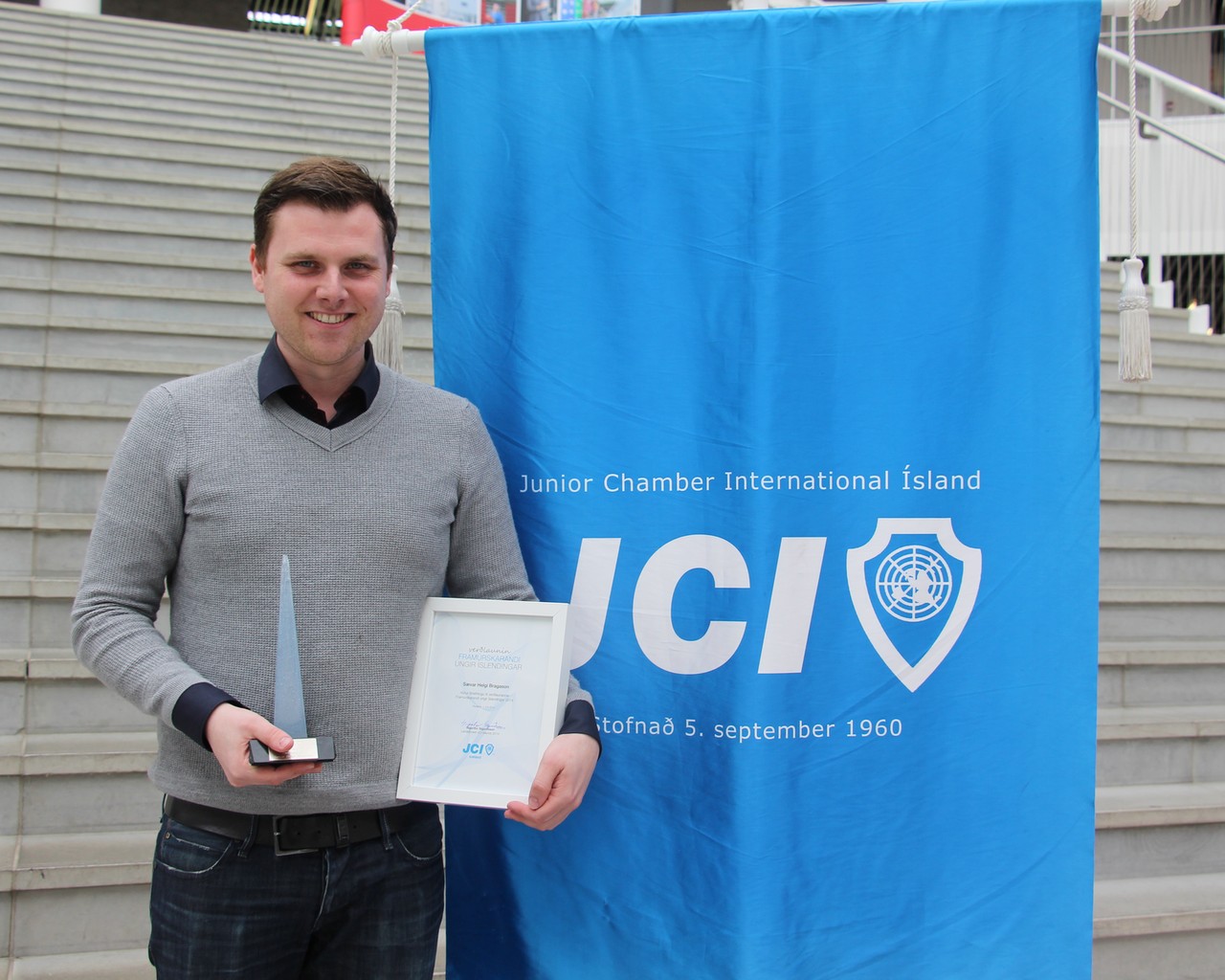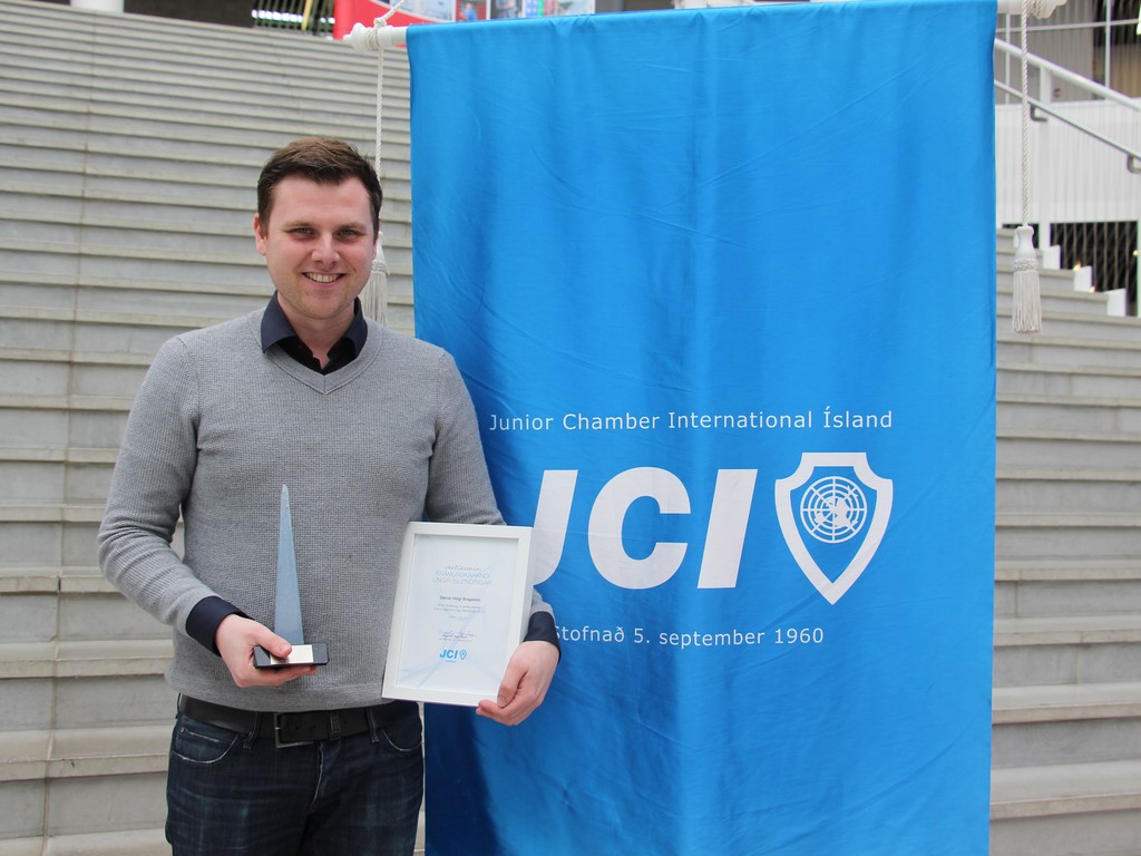 UNAWE coordinator Sævar Helgi Bragason proudly shows his award for Most Outstanding Young Person in Iceland to the public and press.