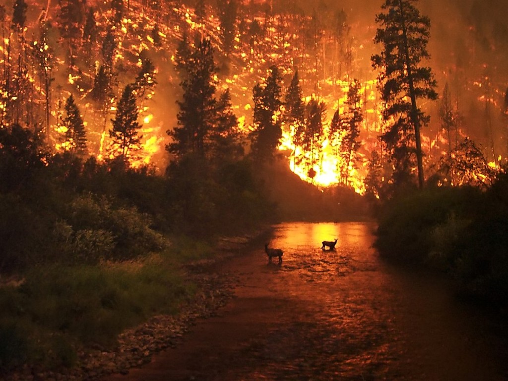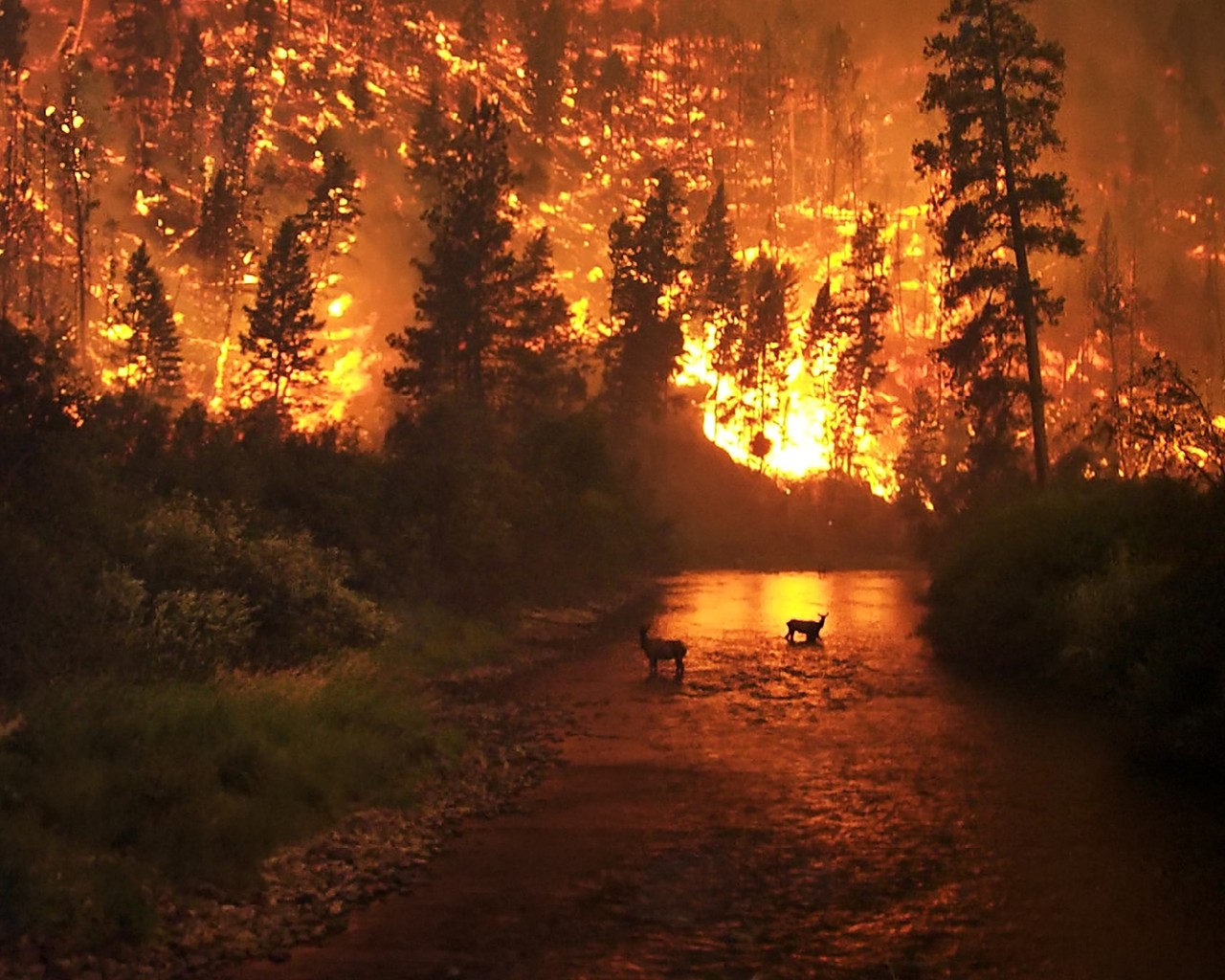 Two elk bathe in a river to escape a wildfire in the Bitterroot National Forest in Montana, United States.
