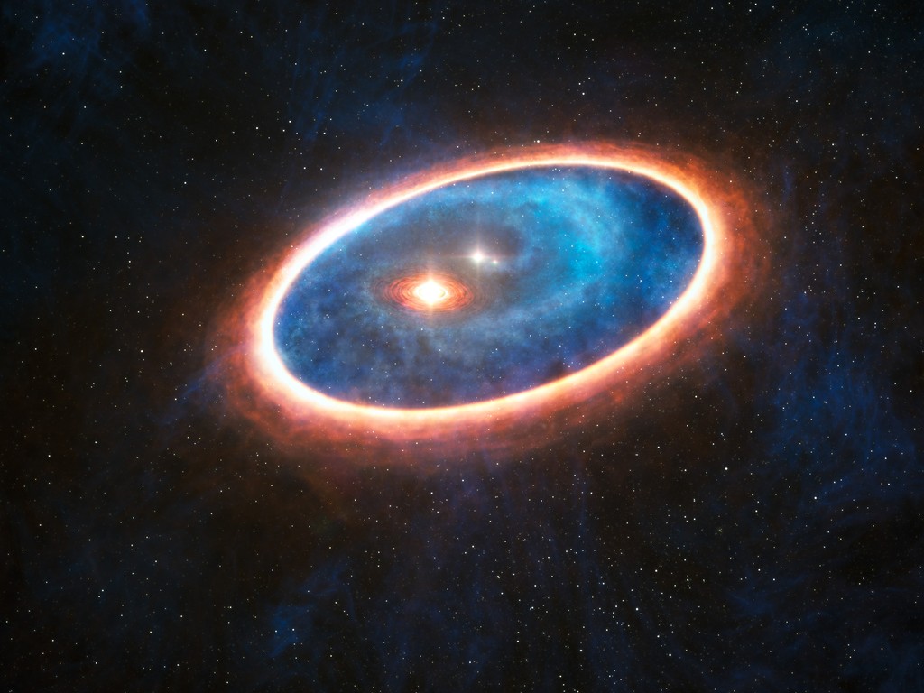 This picture was created to show two rings of cosmic dust that has just been found in a binary star system. The most exciting ring can be seen circling a star at the centre of the image. This cloud includes the ingredients for a new planet! Normally the stars in this twin-star system would gobble up this sort of cloud in no time. But this one has found a way to survive, improving its chances of one day becoming a planet!