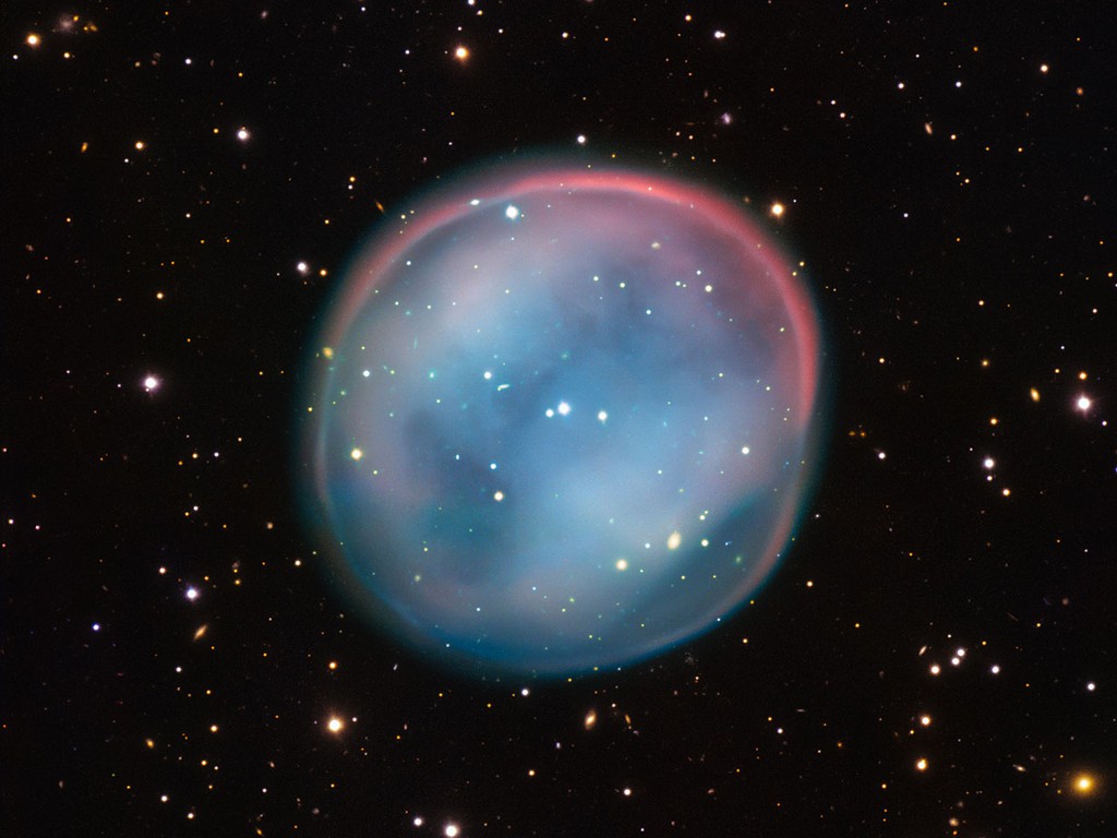 The beautiful bubble in this space photograph is the glowing ghost of a star that was caught haunting the darkness of space. The ghost is called a planetary nebula, and it’s formed from the lingering remains of a dead star. This planetary nebulae is called the Southern Owl Nebula.