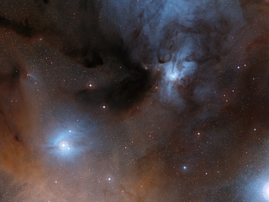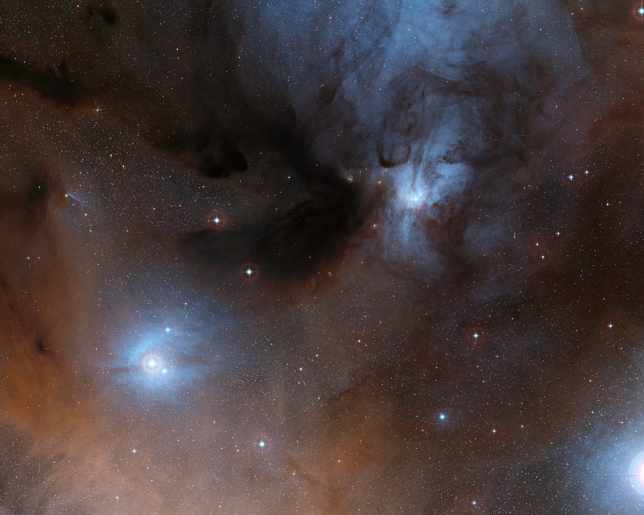 This spectacular image shows a region of space full of dark and bright clouds. Hidden within the picture are the three young Sun-like stars around which organic matter has just been detected!