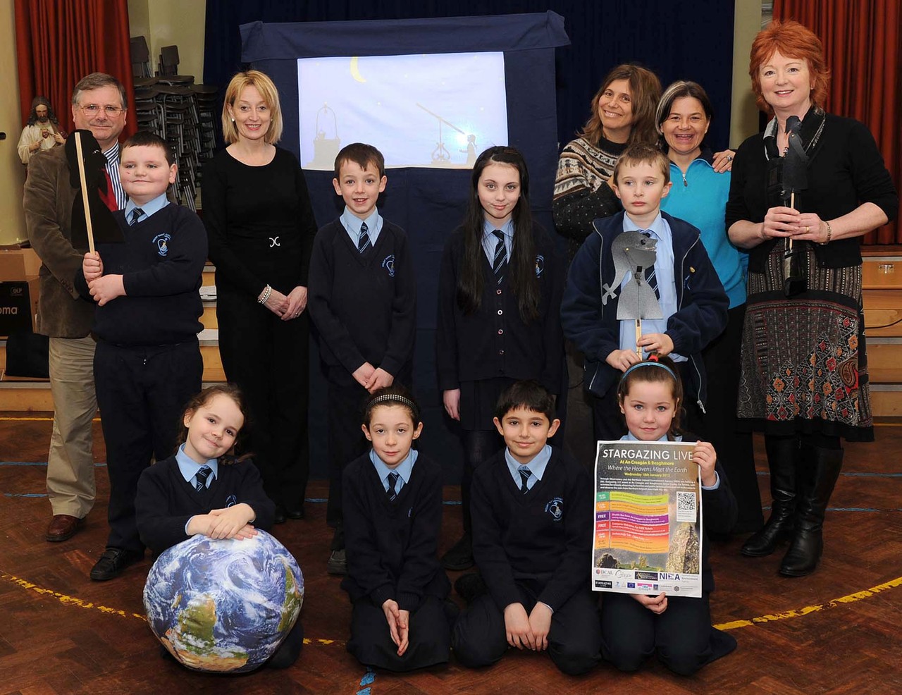 During the BBC’s Stargazing LIVE in 2012 January, UNAWE staff at Armagh Observatory were joined by visiting UNAWE staff from the world famous Arcetri Observatory, Florence, Italy to provide a Shadow Theatre production on Galileo at Mt St Catherine’s Primary School Armagh. Over 100 children and their teachers took part in science experiments on sound waves and gravity as well as enjoying the production “Virginia and Galileo Galilei: a sky full of discoveries” by Italians Lara Albanese and Alessandra Zanazzi.